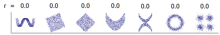 Pearson’s correlation coefficient is only sensitive to the linear dependence between two variables. It is possible that two variables have a perfect non-linear relationship when the correlation coefficient is low. Notice the scatter plots below with correlation equal to 0. There are clearly relationships but they are not linear and therefore cannot be determined with Pearson’s correlation coefficient.
